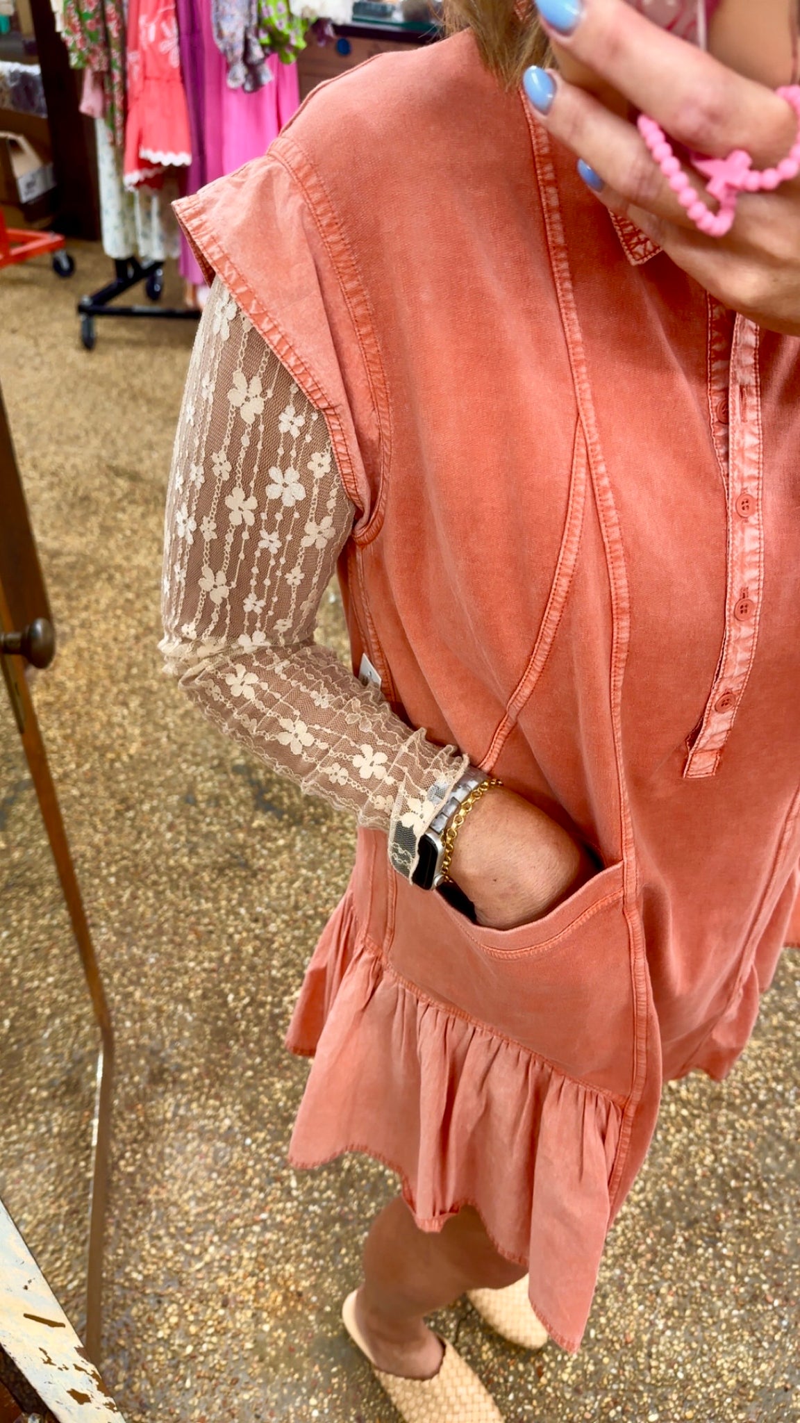 Solid dress with mixed materials.