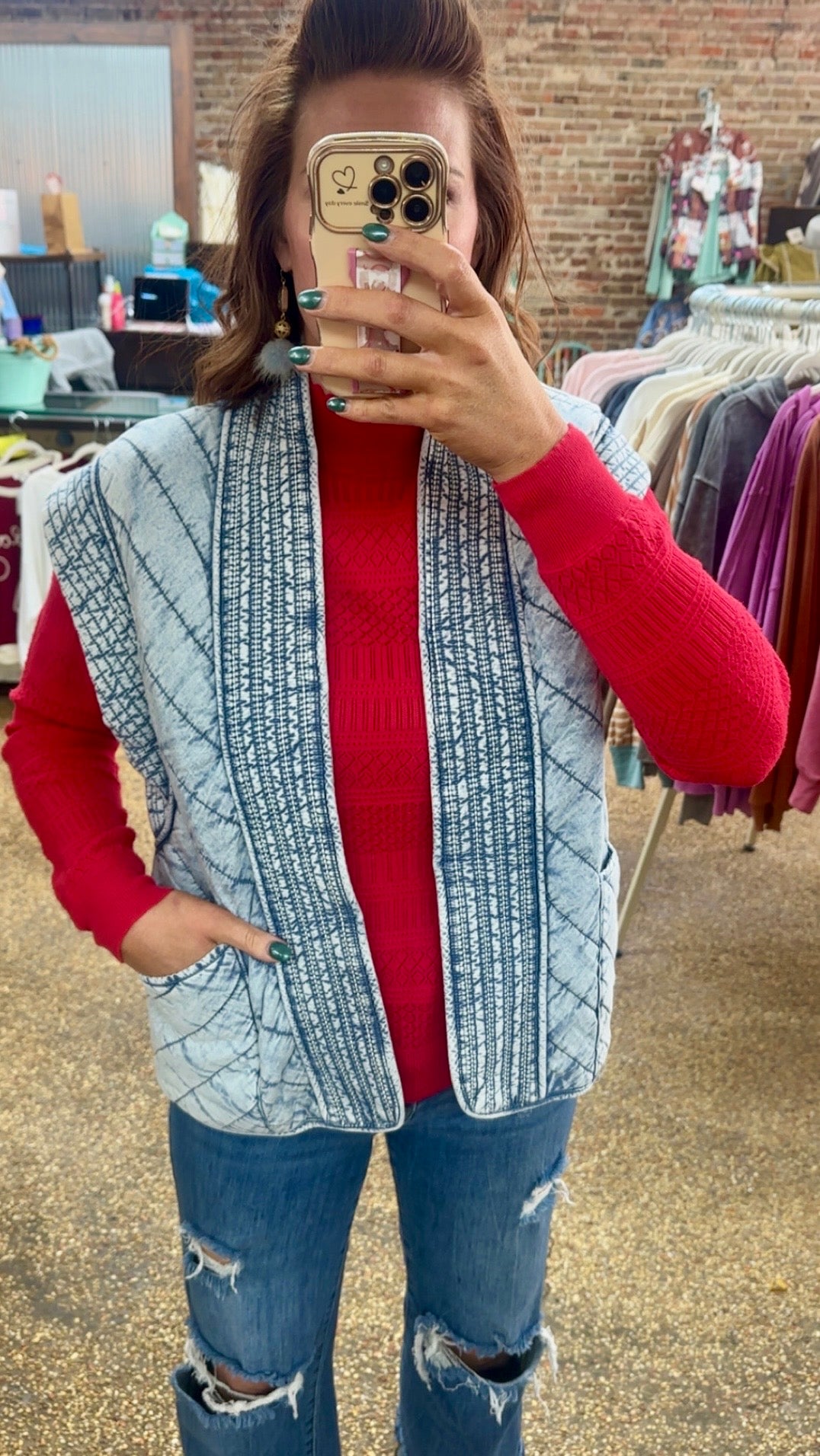 Pointelle mock neck scallop detail top.
