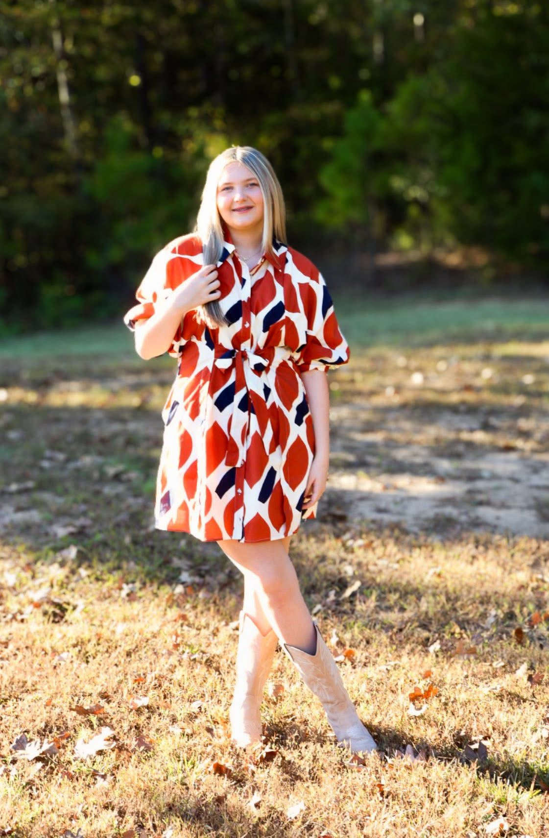 Rust and Navy print dress with front tie.