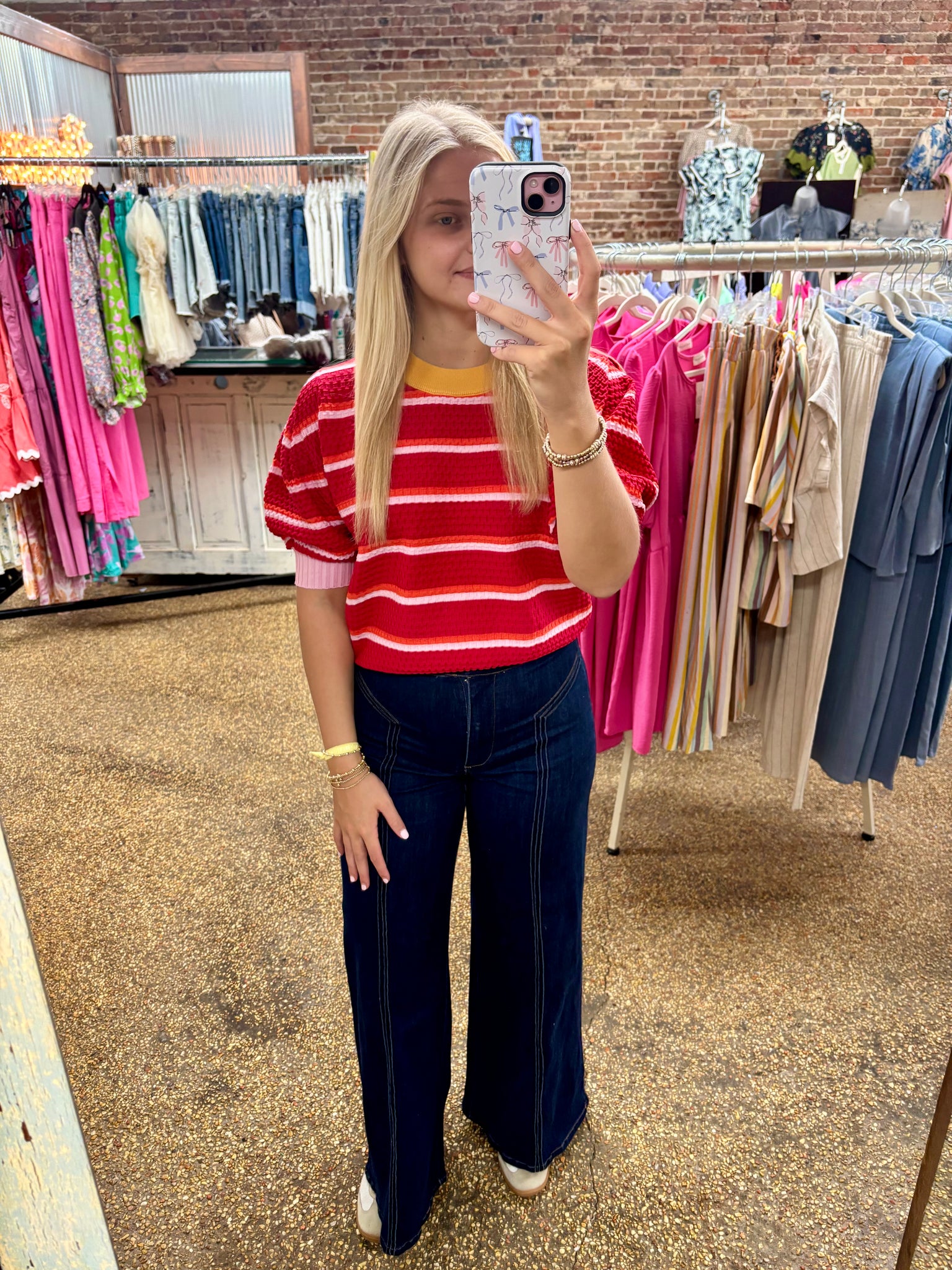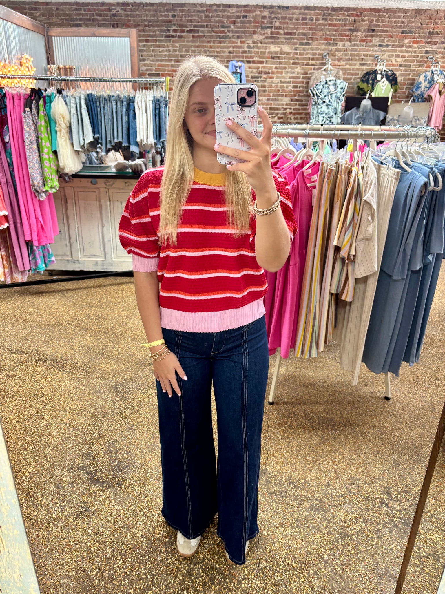 Textured short sleeve stripe sweater top.